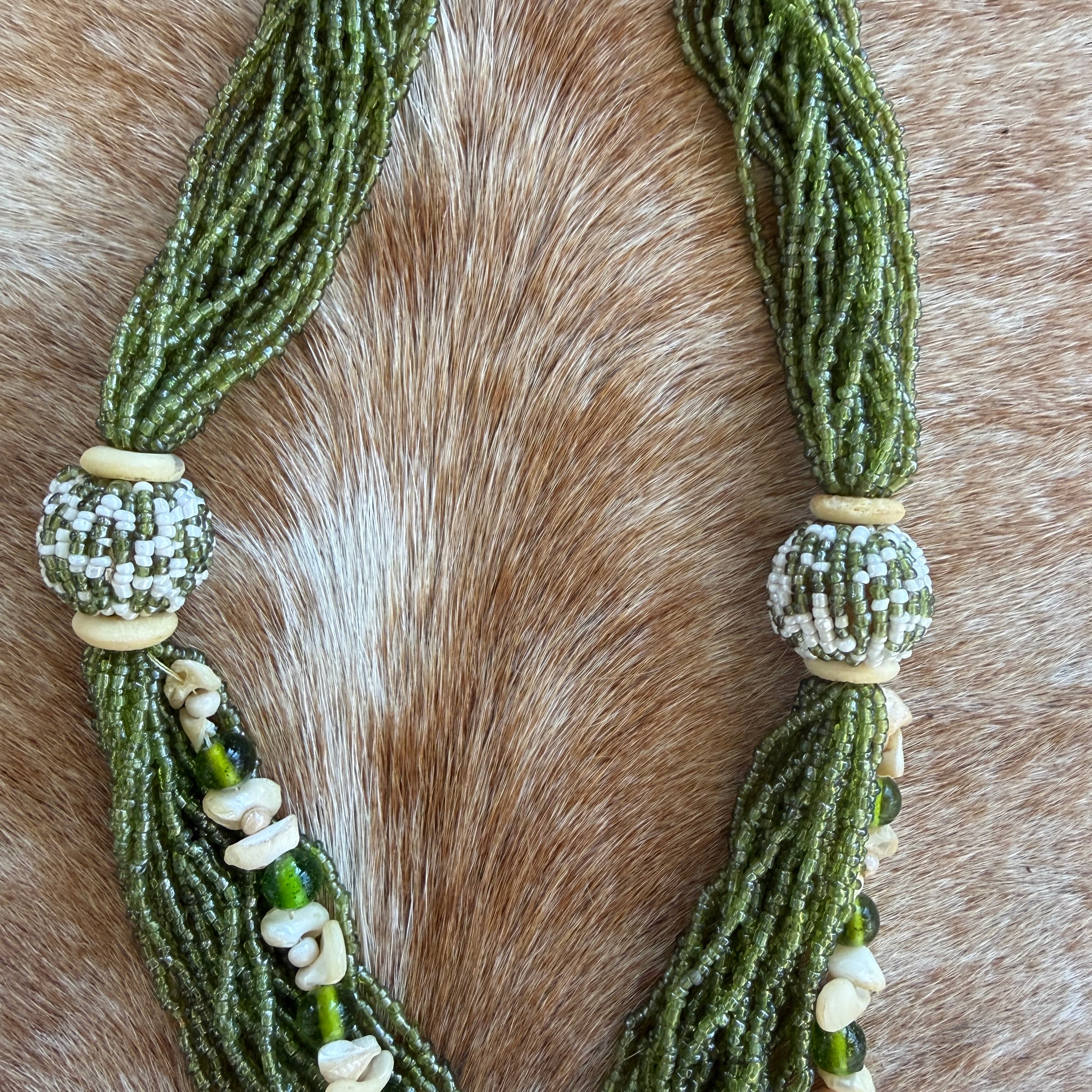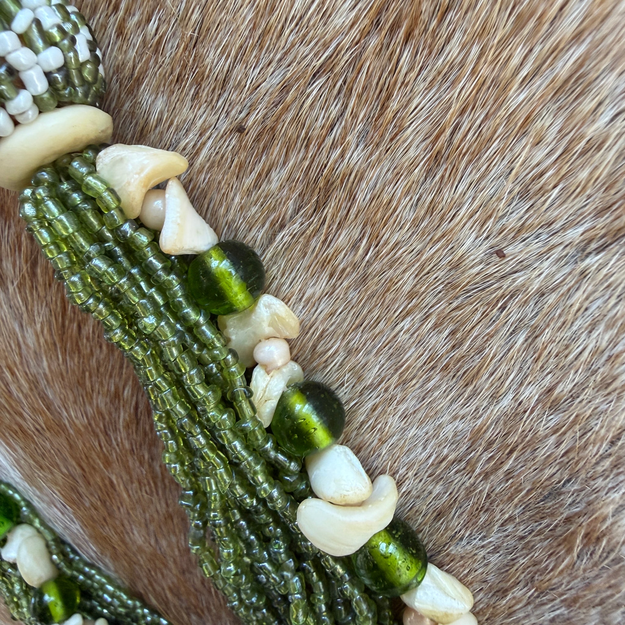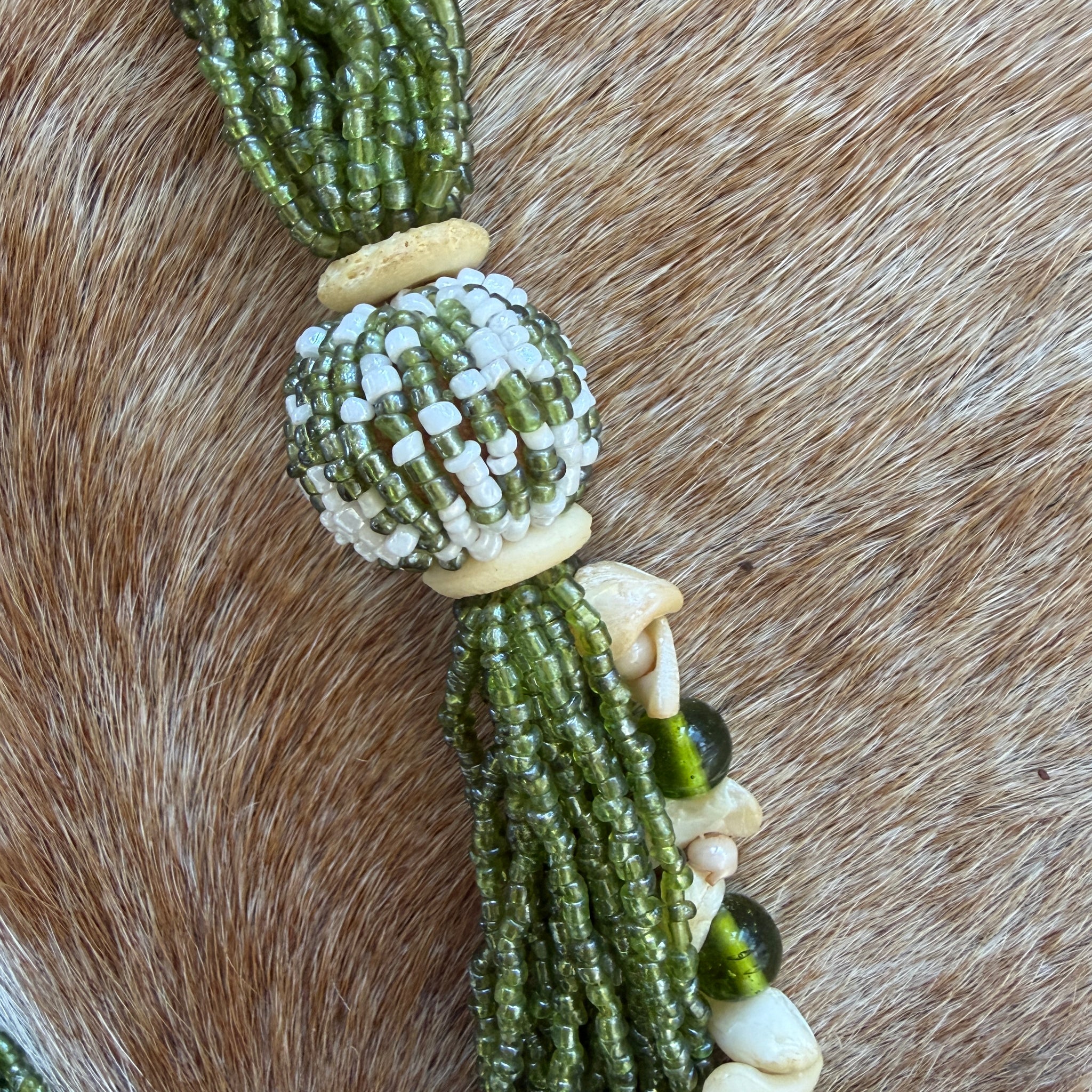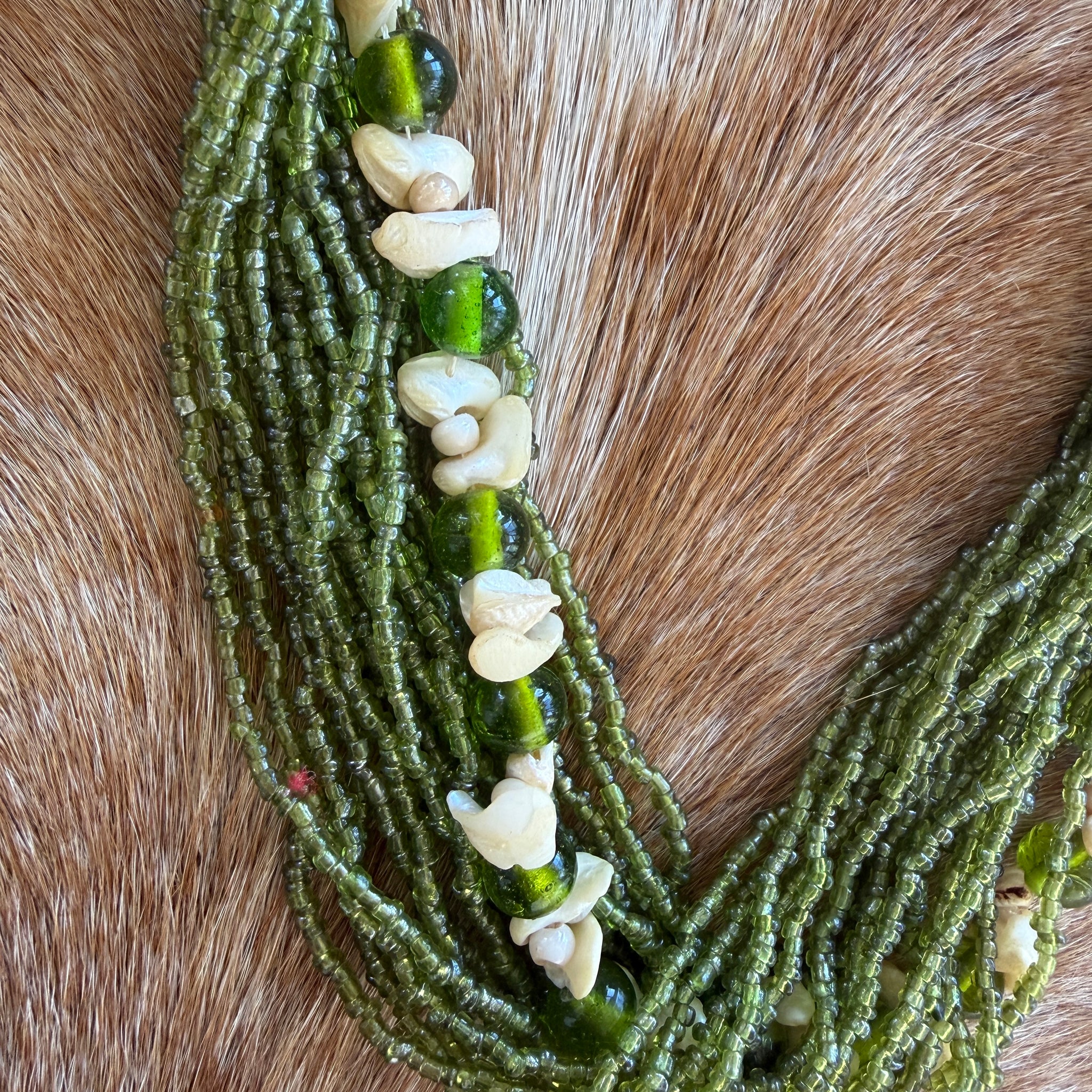 Tiny ornate green beading and delicate shells make up this beautiful statement neck piece