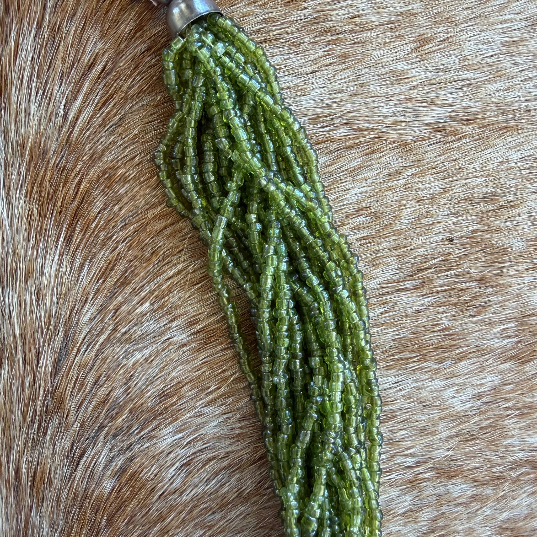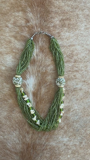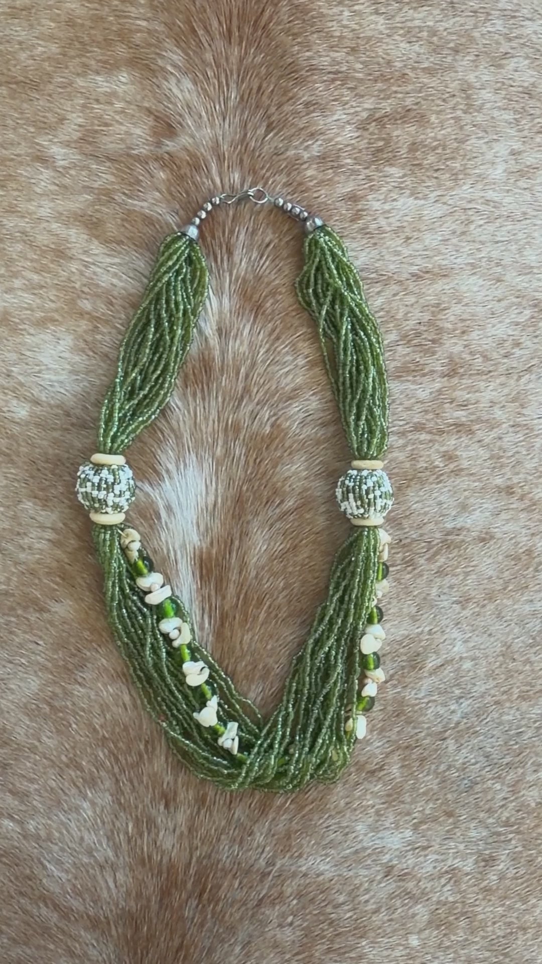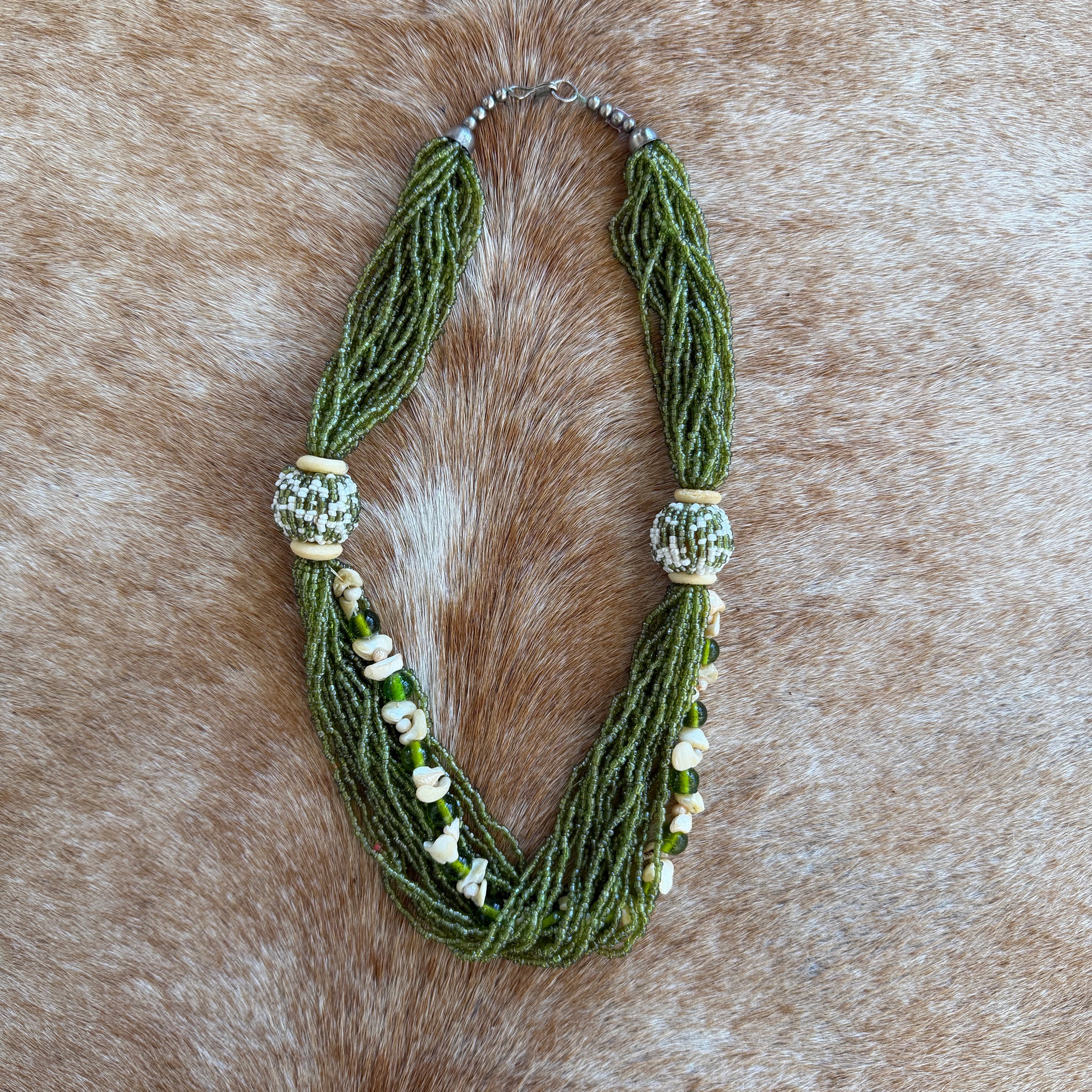 Tiny ornate green beading and delicate shells make up this beautiful statement neck piece