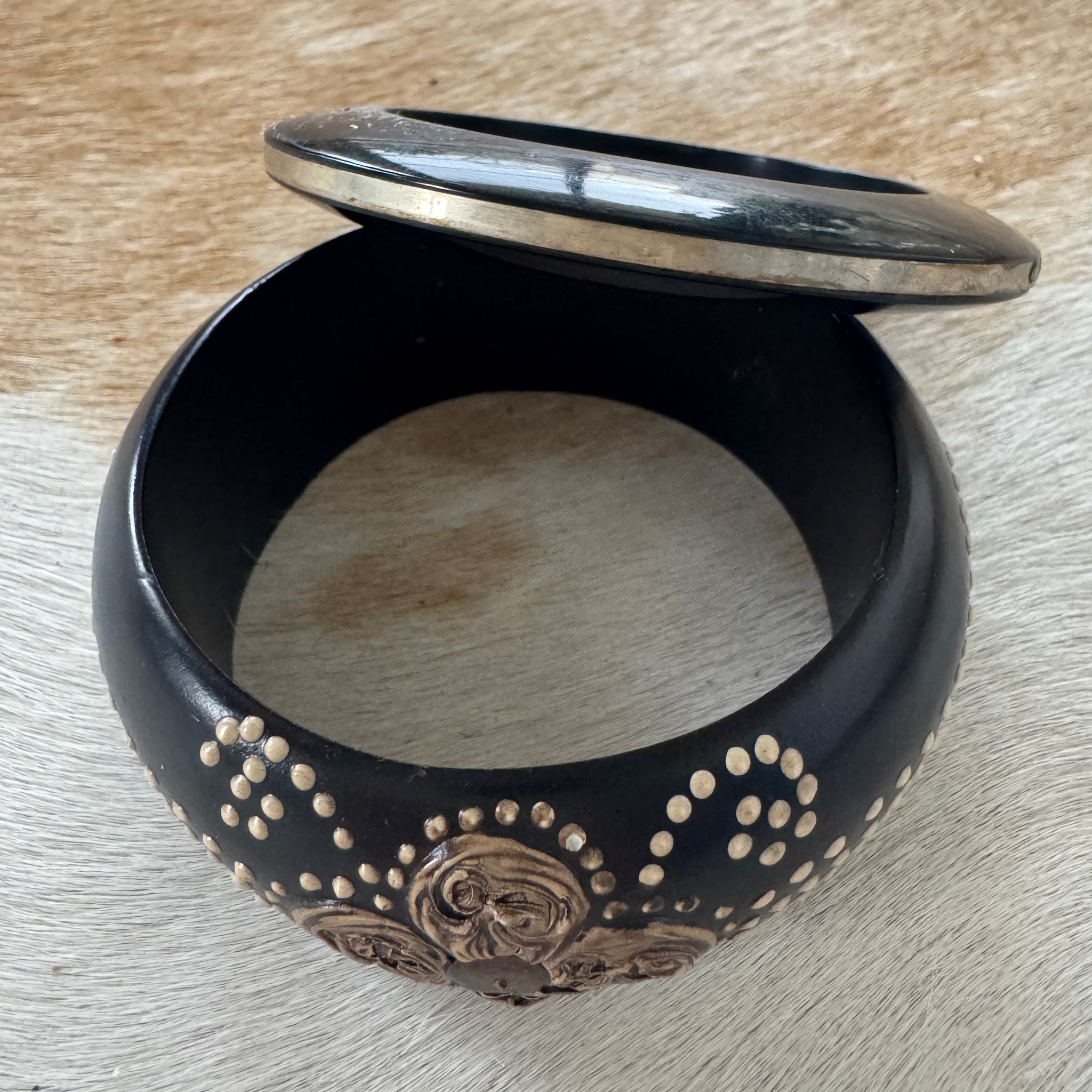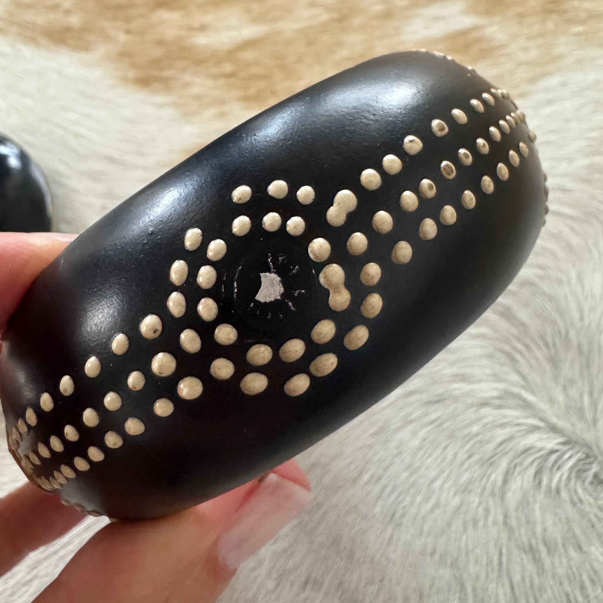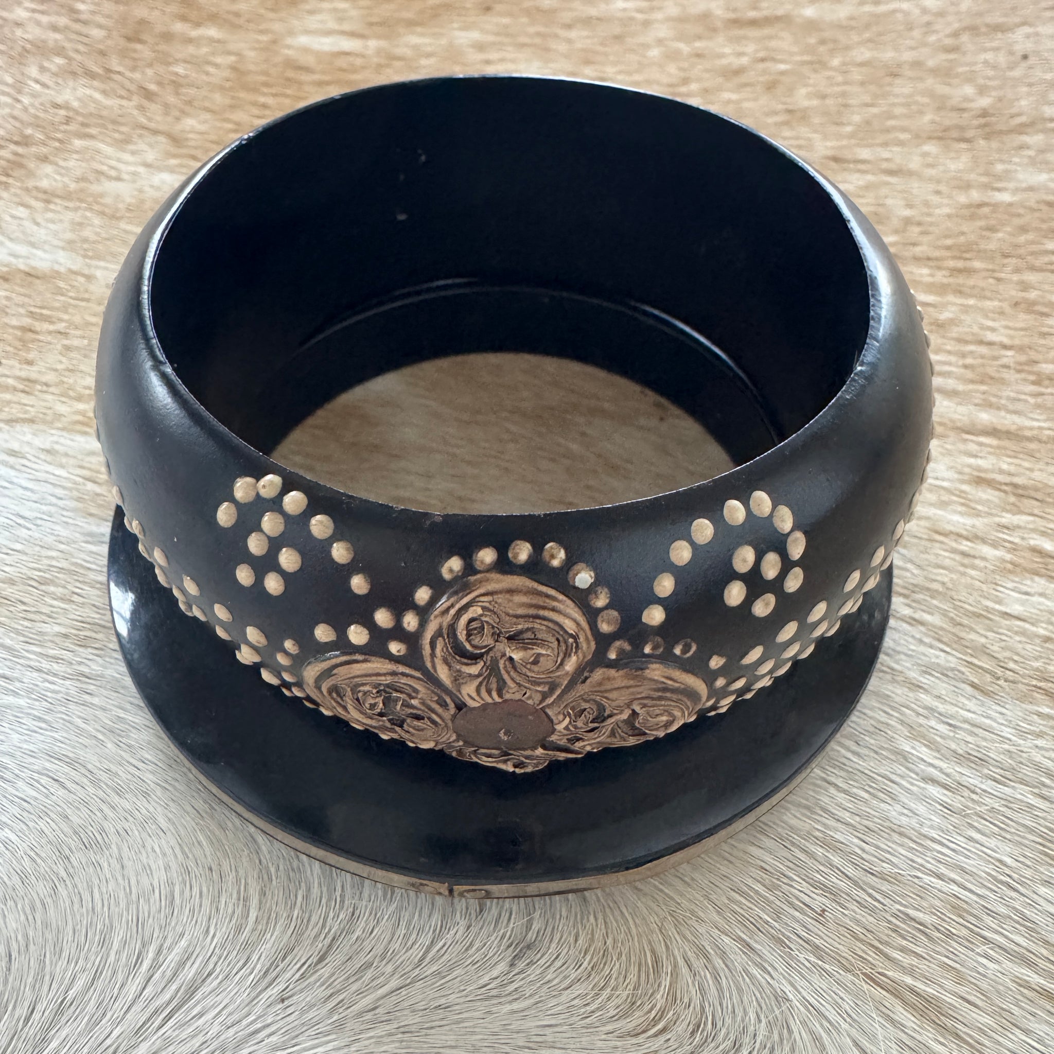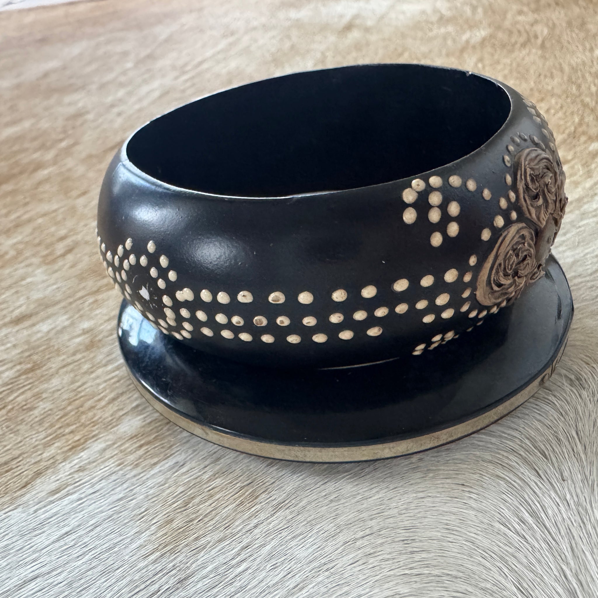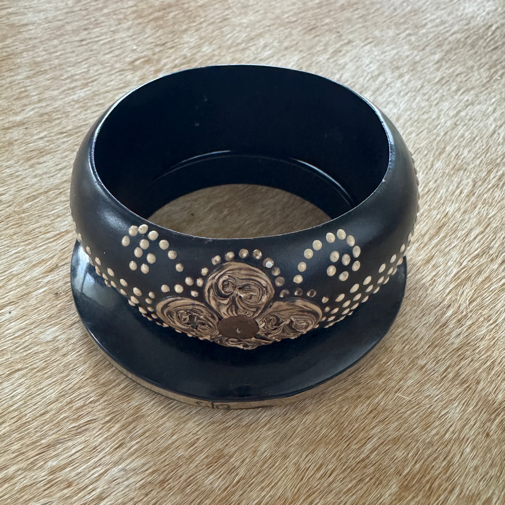 Set consists of 2 bangles - one thick black with embellished brown and white hand painting and one smaller bangle with antique gold trim
