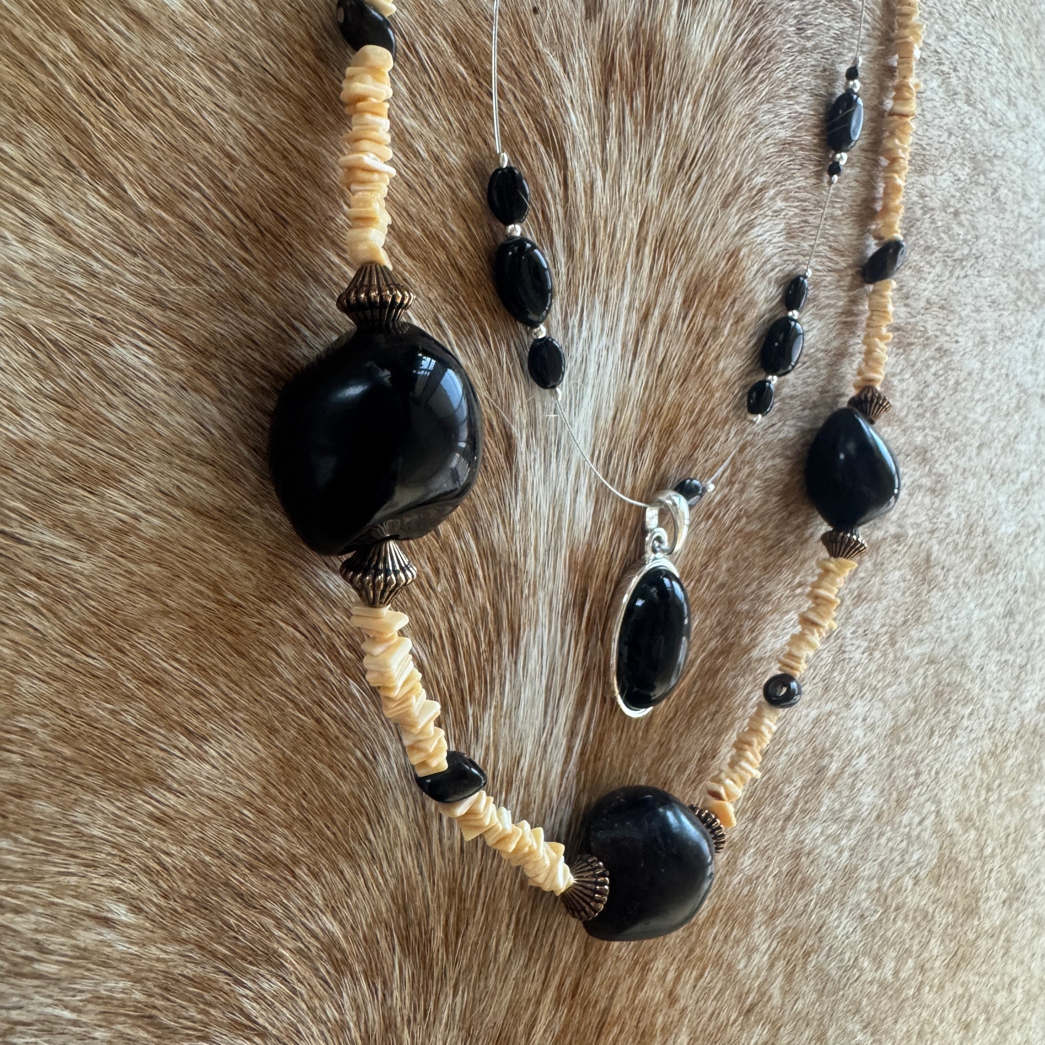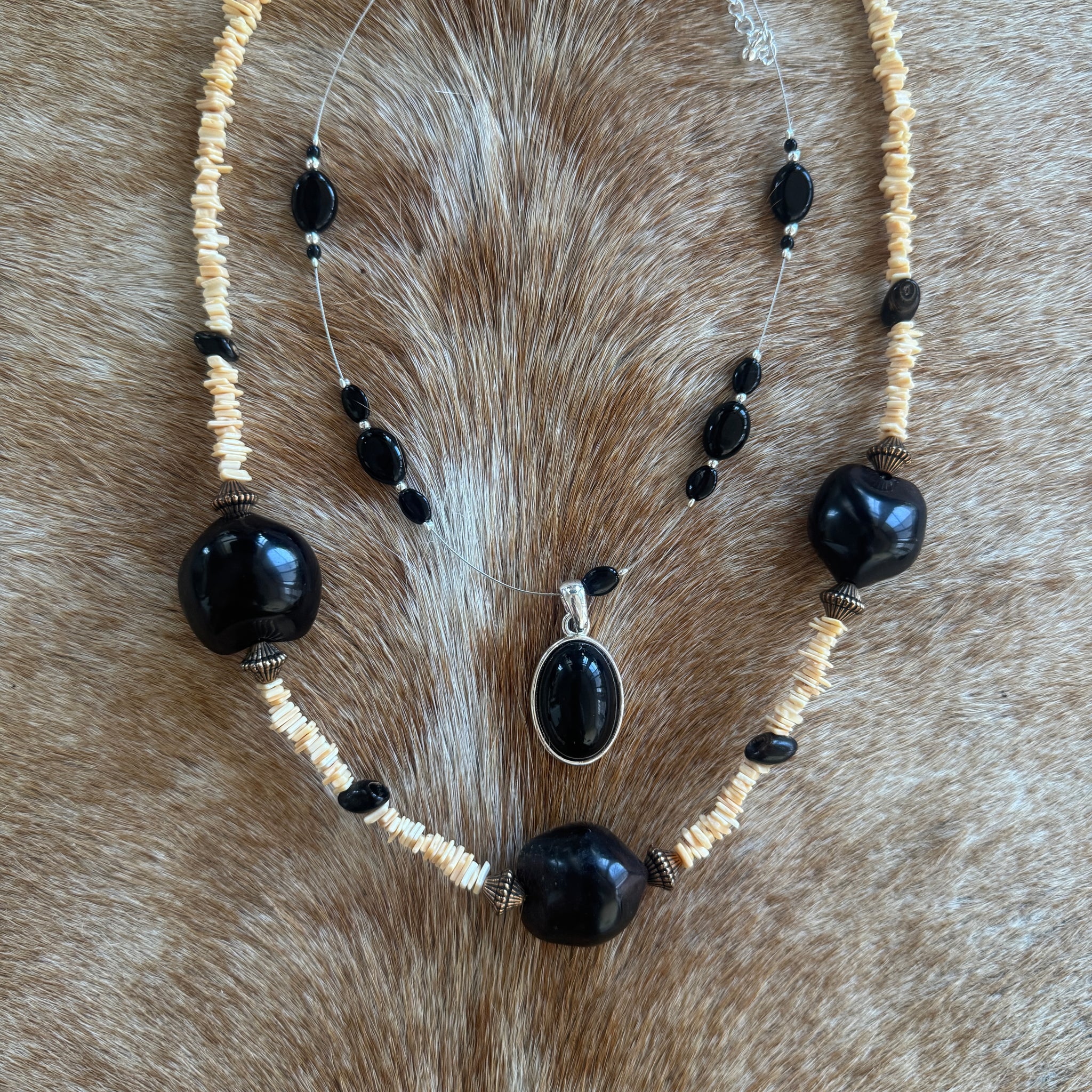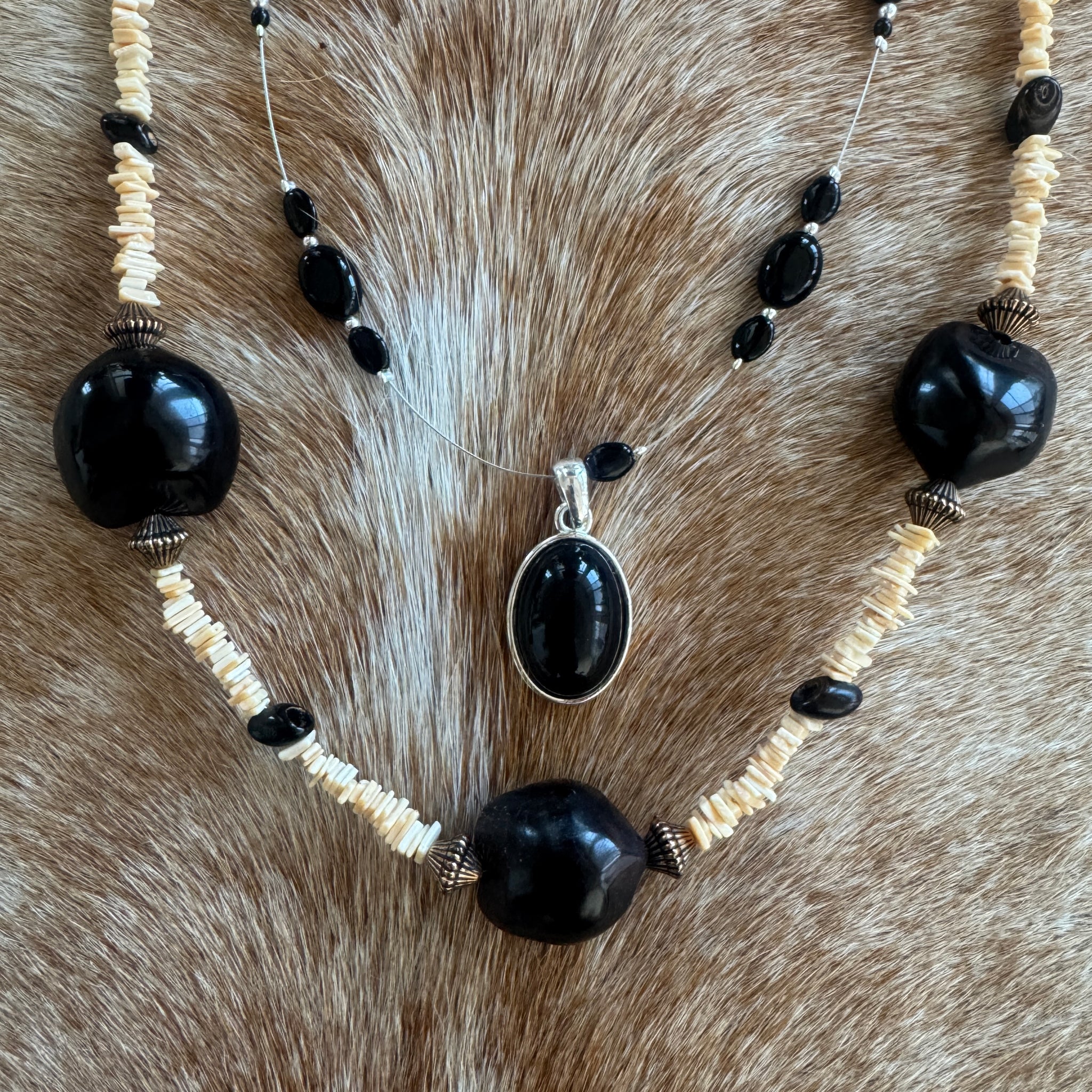 Gorgeous shells, wood and fine beading make this the perfect on trend matching set