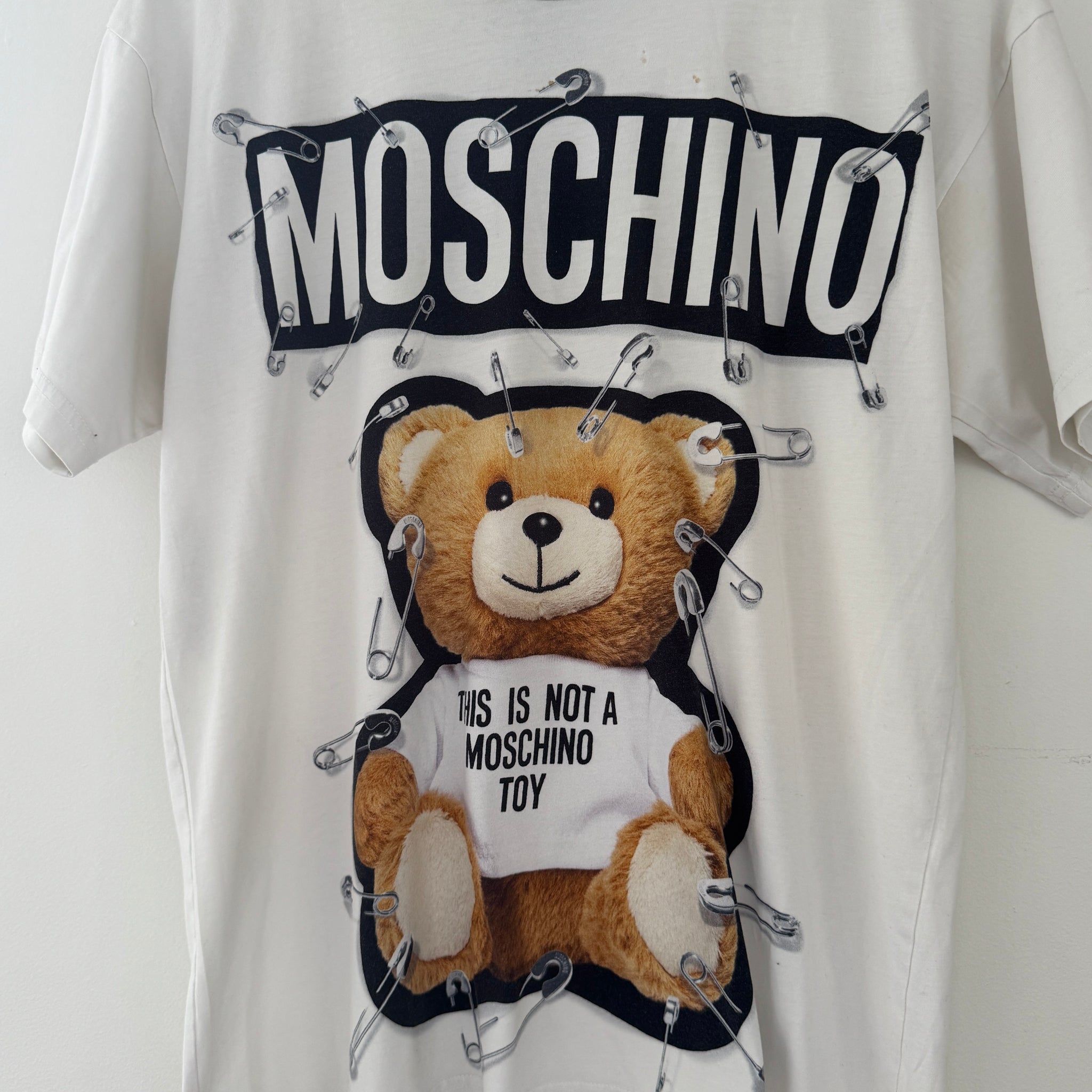 Features 'This is not a Moschino toy' teddy bear and safety pin graphics