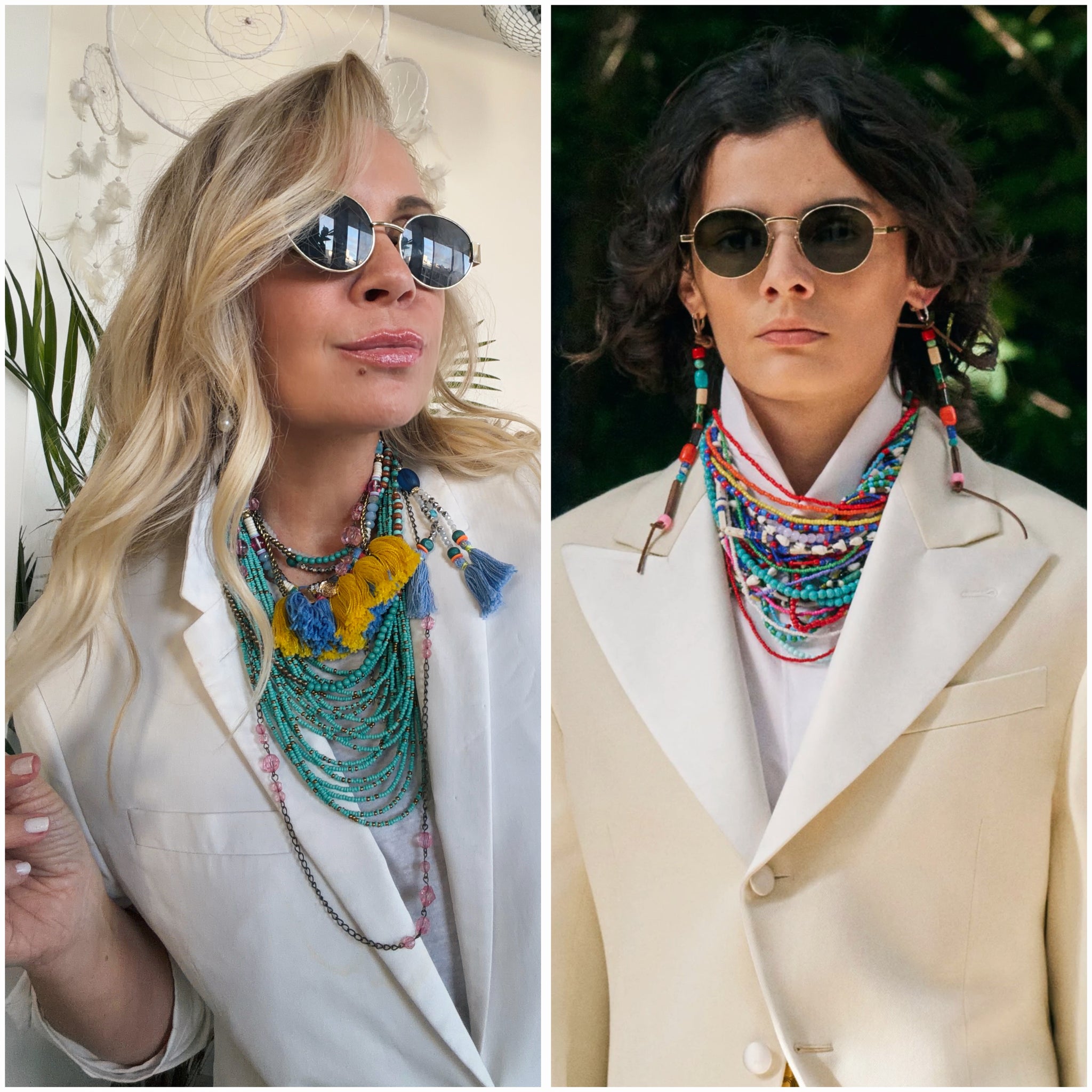 The contrast of crisp white suiting and colorful trinkets and talismans is such a cool vibe
