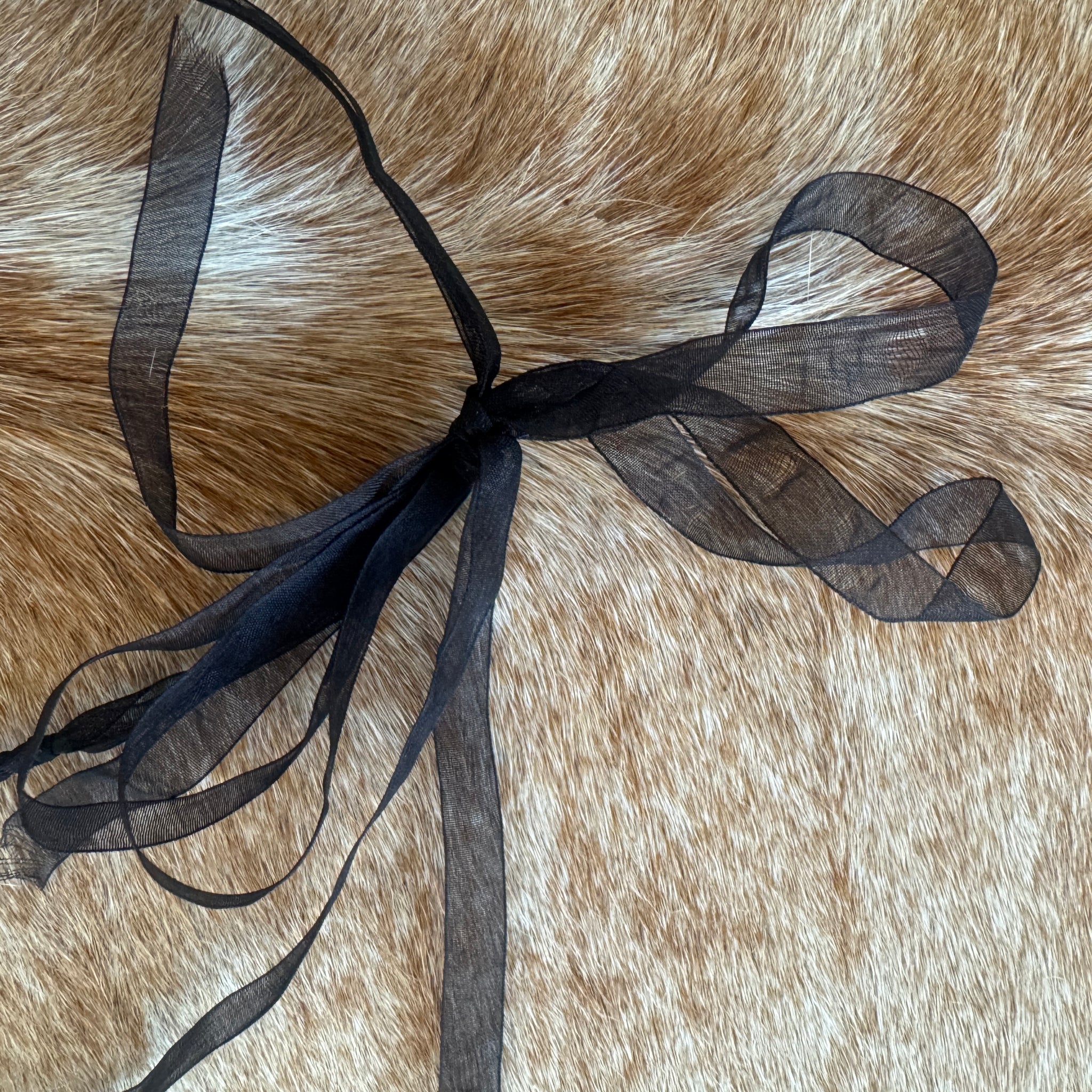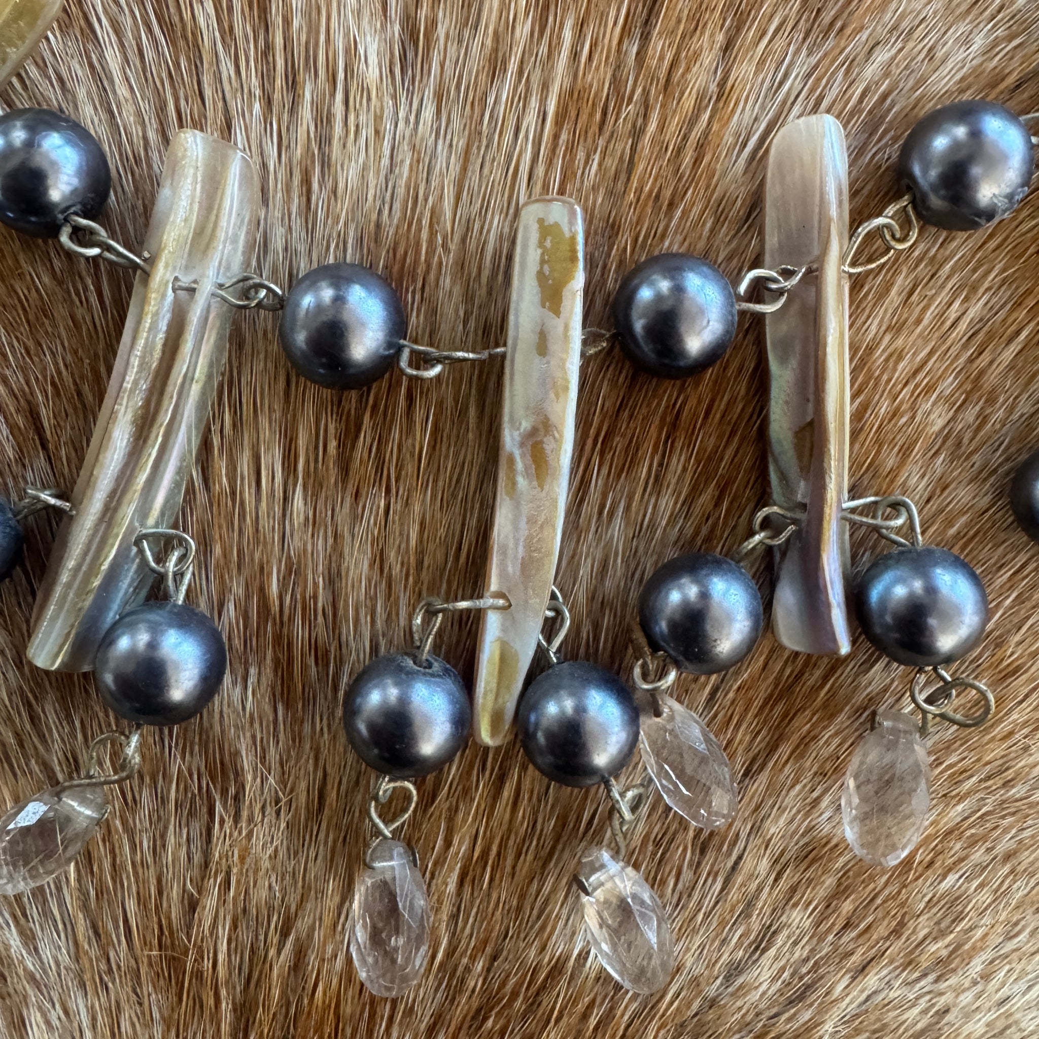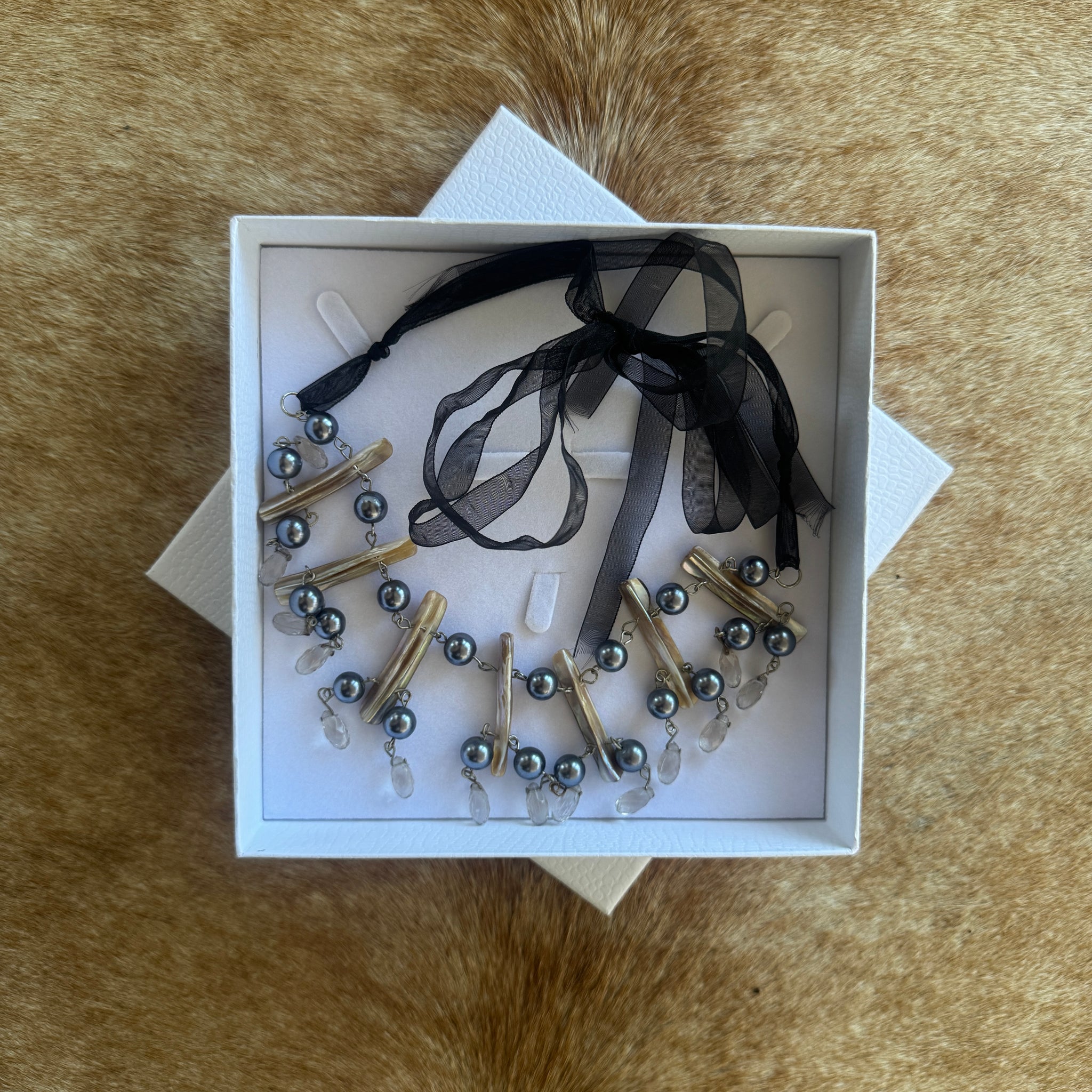 This statement neck piece sits around the collarbone area and is set on delicate taffeta ribbon and contrasted with moody silver peals, natural shells and accented with crystal drops
