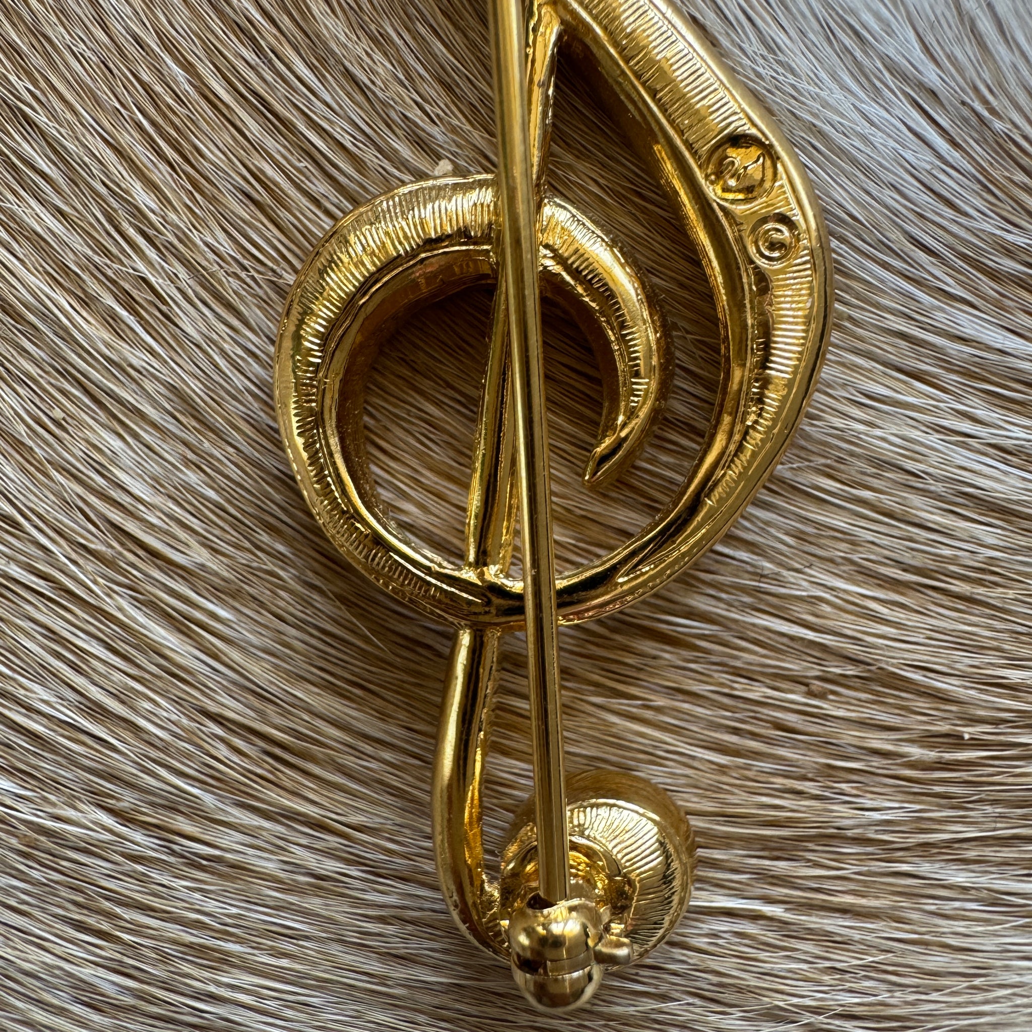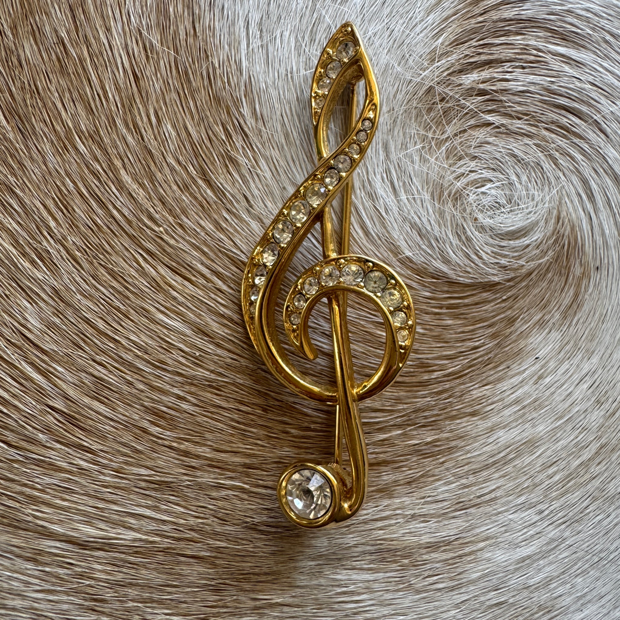 Gold and diamante treble clef music note brooch in pristine condition.