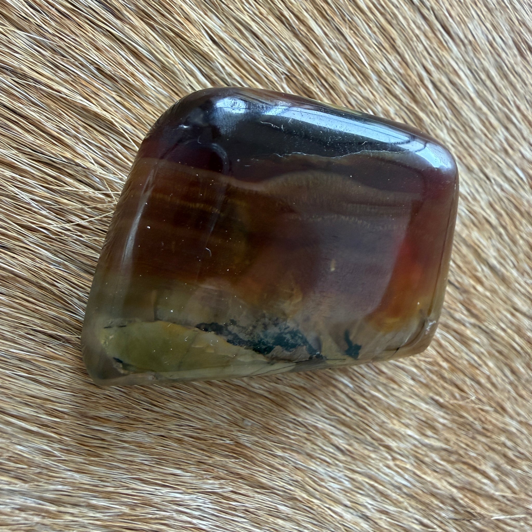 Beautiful colors within the crystal depending on how the light hits it - brown, orange, blue, greys and cream.