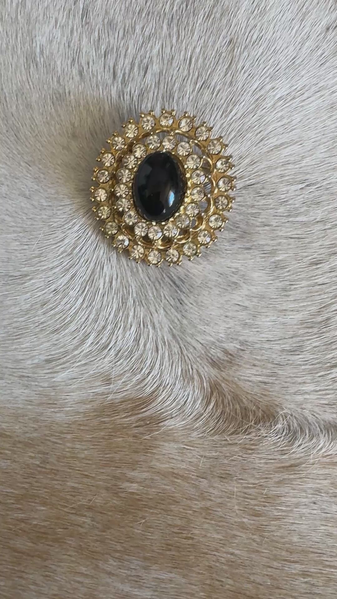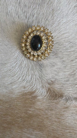 In gold and diamante tones with a stunning black jewel centre this vintage brooch is a show stopper